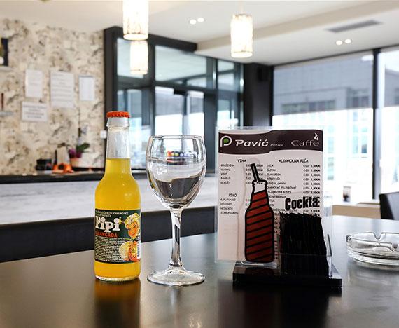 U sklopu benzinske pumpe se nalazi i moderno uređen Caffe bar sa izvanrednom ponudom alkoholnih i bezalkoholnih pića, svježe ocijeđenog soka i vrhunske kave. U ponudi imamo i kavu za ponijeti ( Caffe to go) , za one koji nemaju vremena u miru sjesti i popiti kavu.